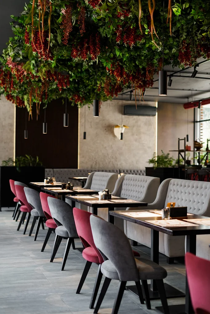 Інтер’єр ресторану виконаний у сучасному стилі з теплими акцентами: натуральне дерево, м’яке освітлення та стильний декор створюють атмосферу комфорту і затишку. Простір продуманий так, щоб гості почувалися вільно й розслаблено, незалежно від формату візиту.