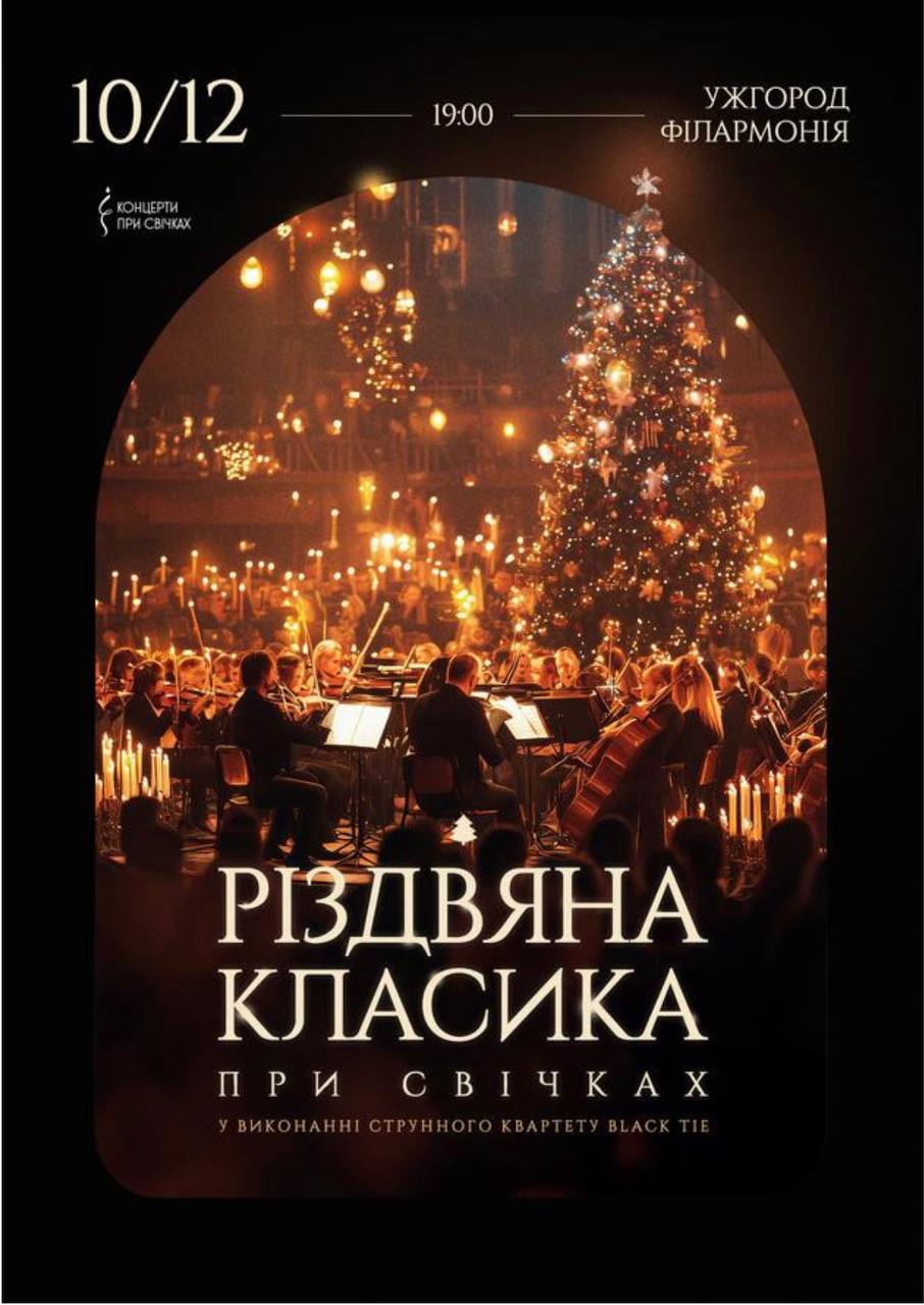 10 грудня (середа), 19:00 📍 Закарпатська обласна філармонія (площа Поштова 10) Запрошуємо на теплий музичний вечір, де сяйво сотень свічок стане чарівним фоном для відомих мелодій, що зігрівають душу. На сцені – майстри своєї справи, музиканти квартету Black Tie, чиє виконання вражає витонченістю, емоційністю. Програма концерту охоплює найулюбленіші мелодії свят: «Щедрик», «Добрий вечір тобі», «Нова …